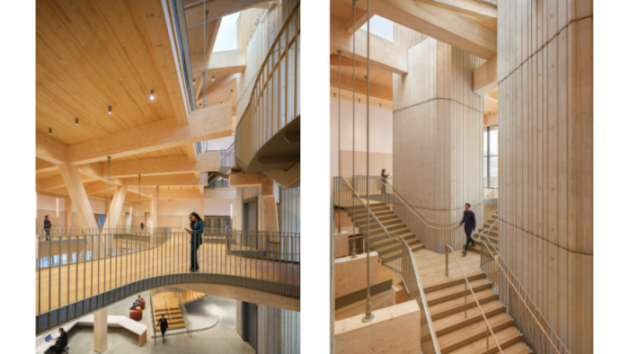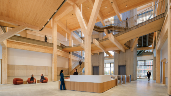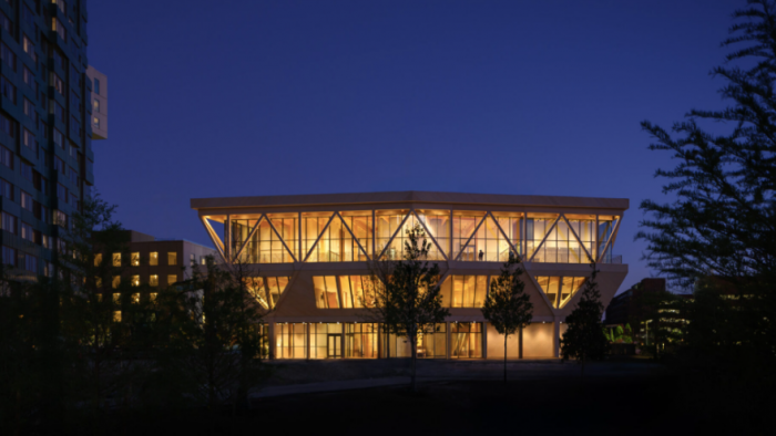 Studio Gang’s newly completed David Rubenstein Treehouse marks a milestone for Harvard University as its first mass timber building. Located within the university’s Enterprise Research Campus in Allston, the 55,000-square-foot conference centre is designed as a space for convening, collaboration, and public engagement. The expressive structure featuring branching timber columns and cross-bracing evokes the experience of climbing into a treehouse, blending playfulness with precision engineering.
