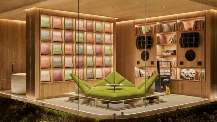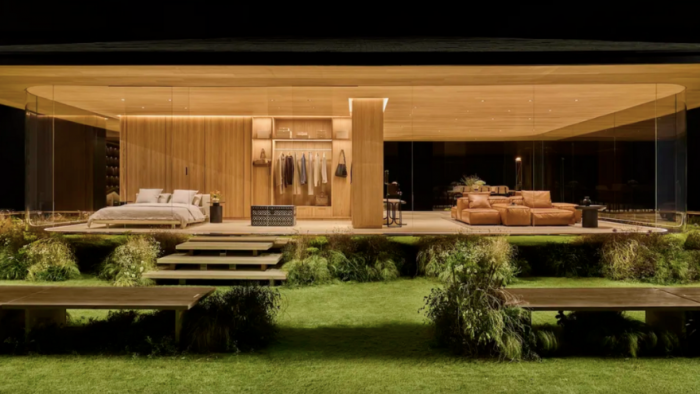 The concept extends architecturally in Drop Haus, a prefabricated timber, modular home unveiled as a centrepiece of the Louis Vuitton menswear show. Conceived as a future living concept, Drop Haus explores mobility and adaptability. Its compact, repeatable modules suggest a new form of nomadic dwelling that can be assembled, relocated and reconfigured, echoing the flexibility of the garments themselves. The structure references modernist prefab housing while introducing a softer, more expressive language rooted in hospitality and human experience.