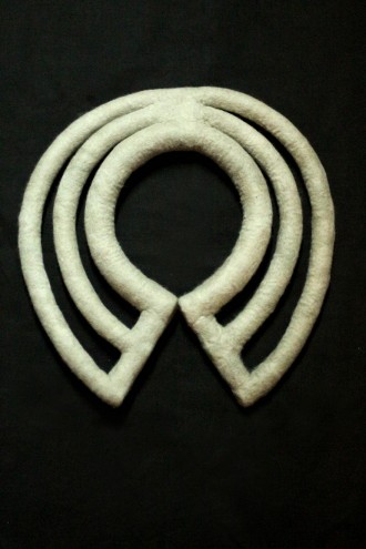 Although some of the pieces are asymmetrical and others symmetrical, the shapes that create them are mostly geometric. This is in stark contrast to the organic nature of the felt material. I think that this is what makes the pieces so interesting, because you have this very rigid, linear structure surrounded by a soft, natural, handmade fabric.
