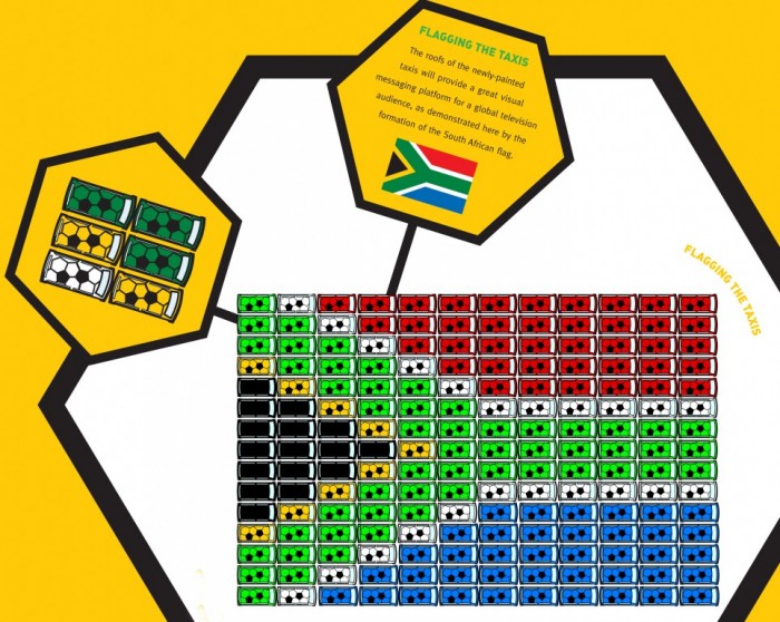 The roofs of the newly-painted taxis will provide a great visual messaging platform for a global television audience, as demonstrated here by the formation of the South African flag.