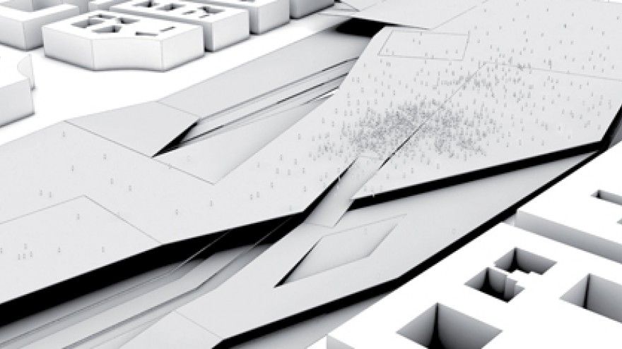 Rejecting monolithic power plants in favour of a move towards varied and dispersed micro-generation, the Crowd Farm draws energy through a responsive flooring system. Blocks that depress slightly under the force of human steps, absorb vibrations of movement that can generate power through the dynamo principle.
