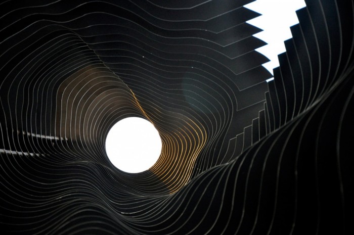Price’s tower is made of steels and appears to move up and down when viewed from a distance. The open-slatted structure of the tower created a watered-silk effect withle the outer shape resembles an undulating body of water as if poured from above. This gesture too, is reminiscent of the fal of Kyneburgh’s body down the well.
