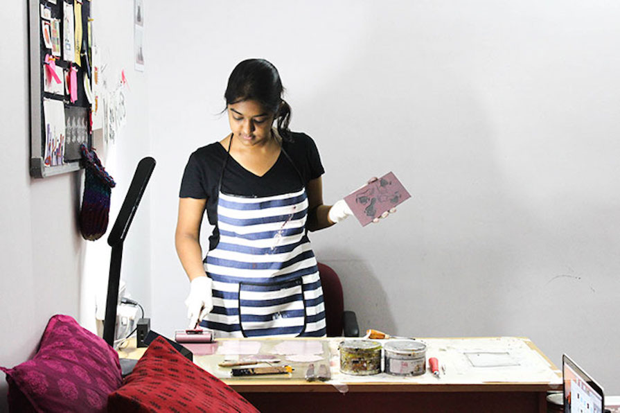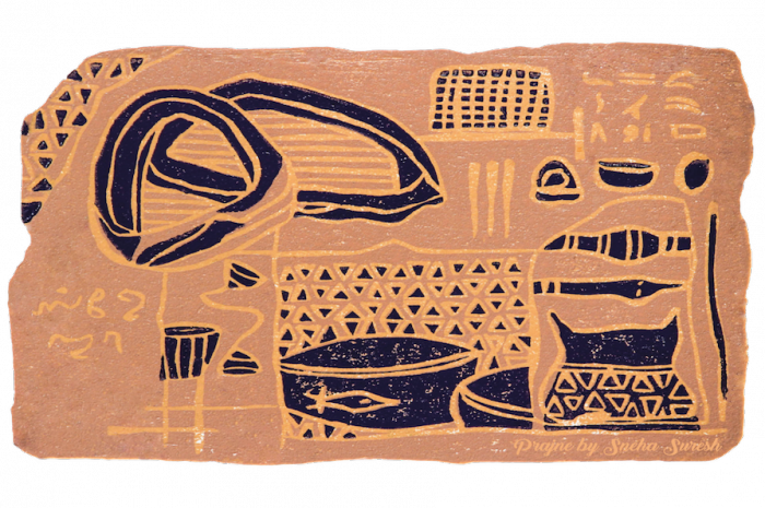 She says that her series of lino printed illustrations are meant to give the narratives associated with certain ancient artefacts, like the ooknikantha for example, a tangible form.