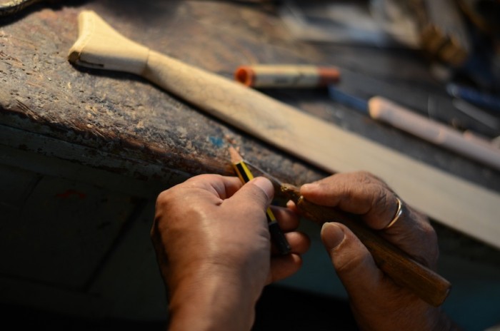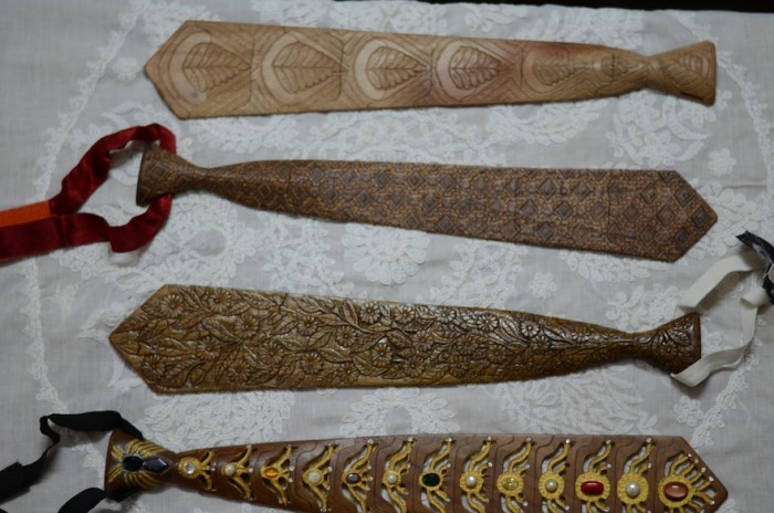 An entire tie is cut from a single piece of polished wood, and each unique design is precisely cut into the surface with custom tools that Sircar made for himself. Once the design is done, the tie is cut into segments and connected with pivot pins to give the finished product its ability to move.