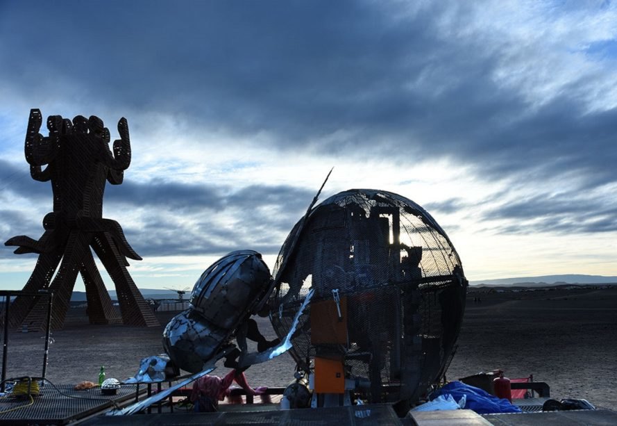 Built by Pretorius, Alliance Earth director Jeffrey Barbee and a crew of 25 people from all across the world, the Dung Beetle structure is made almost entirely from recycled metal. Created using African skills and technology, it features an enormous, three dimensional figure of a beetle, a compartment housing the reactor system, and an art stage that unfolds from the heavy duty trailer as a teaching and learning centre.