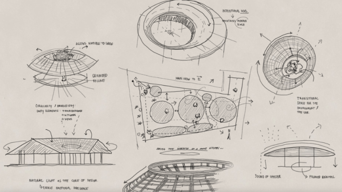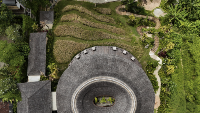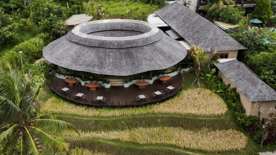 At its heart is a circular structure that organises social and dining spaces around a central opening, framing views of the surrounding rice fields and beyond. The geometry allows daylight and cross-ventilation to permeate the interior without reliance on mechanical cooling systems, directly responding to the region’s tropical heat. The stepped roof design further supports passive cooling by venting warm air toward the centre while directing rainwater inward, where it is managed sustainably on site, creating a circular water-harvesting system suited to the area’s high rainfall.