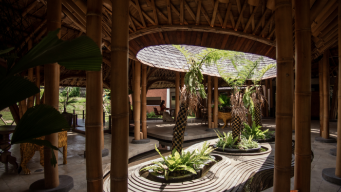 The primary structure is crafted from locally sourced bamboo, articulated through a series of arches and a defining A-frame that lends both strength and fluidity to the enclosure, while enhancing resilience in an earthquake-prone territory. A skylight clad in SolarTuff panels sits on a discreet steel frame that complements the bamboo structure, while ulin wood shingles, executed by local artisans, add rich texture to the roof.