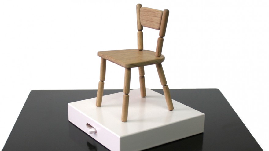 Miniature Lazy Chair by Fresh West: A 1:6 scale version of their classic exhibition crowd pleaser, the collapsible Lazy Chair. A push of the lever and the Lazy Chair collapses, slowly returning to its standing position under the force of a torsion spring.