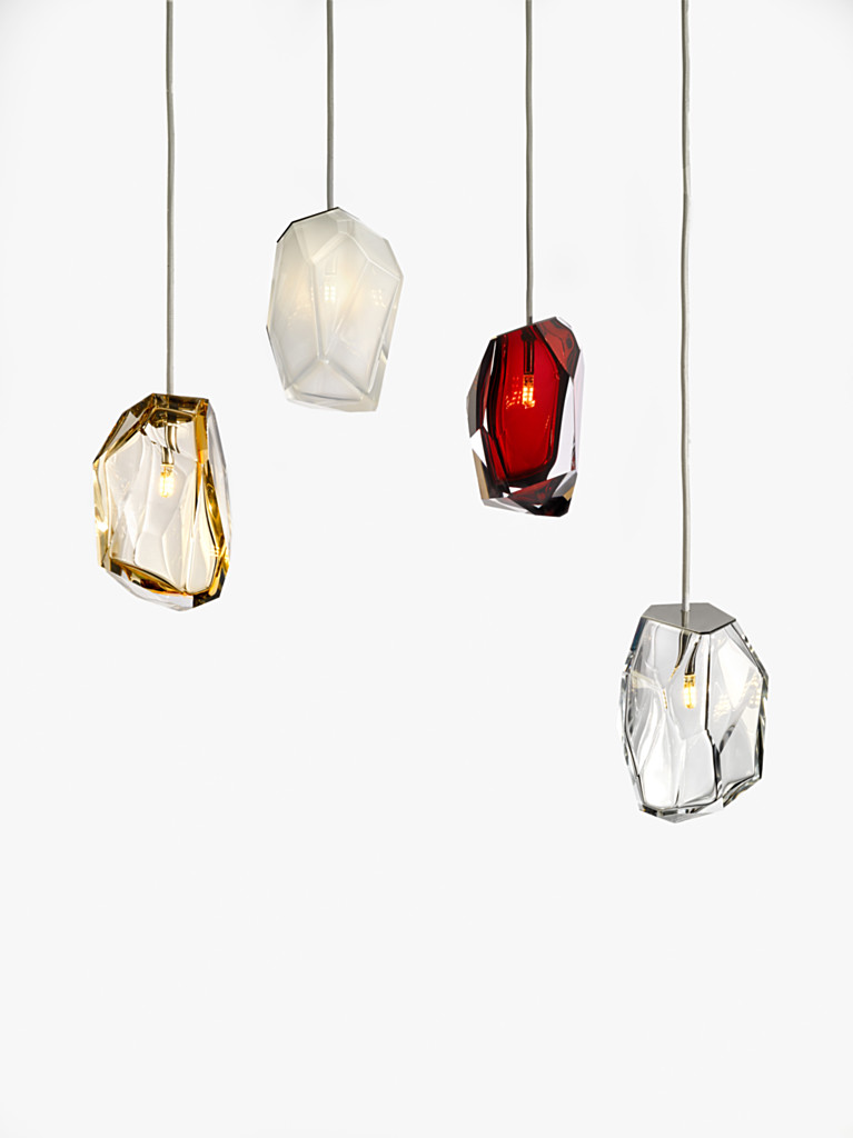The unique characteristics of Crystal Rock are gathered within a perfectly cut, yet roughly sculpted contemporary shade that allows multiple refractions and deflections during the day as well as when lit at night.