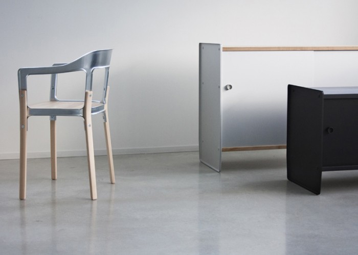 “Theca” sideboard combines an aluminium body and sliding doors with wooden shelves that bolt to the sides of the unit.