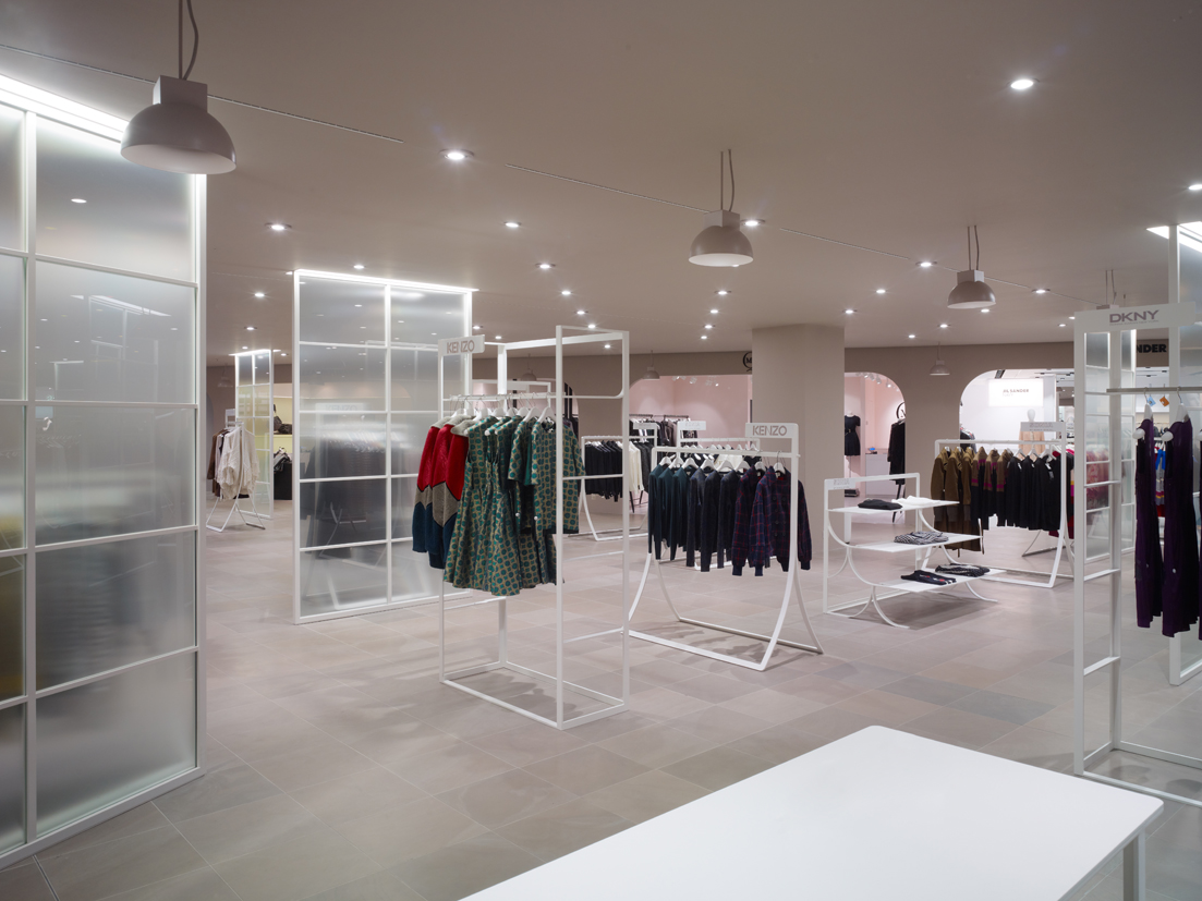 To function as subtle space dividers, Nendo installed 17 large windows, reminiscent of those seen around the city, and applied an opaque film to the glass. When looked at from an angle the dividers appear as symbolic impressions of courtyard gardens and public squares, while remaining transparent when viewed directly. This allows products to suddenly appear and fade in front of shoppers to create an experience of a constantly changing Milanese environment.