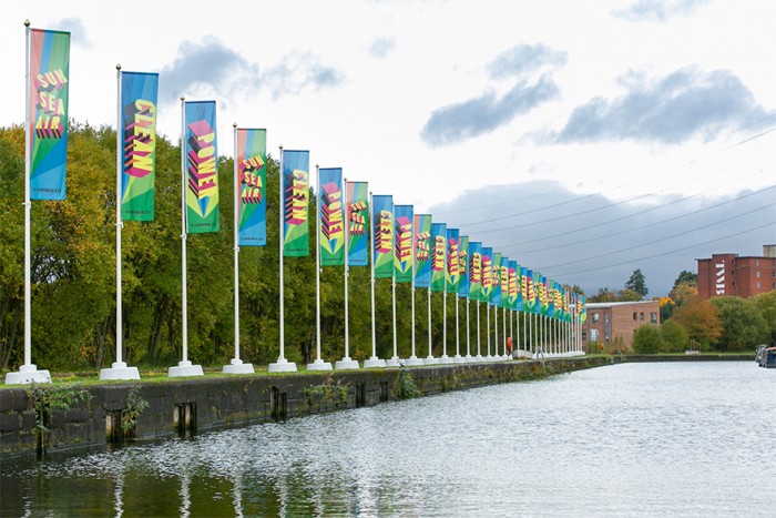 Myerscough designed 40 brightly coloured flags made of recycled ocean plastic, which #TOGETHERBAND placed alongside the canals of Glasgow, to coincide with COP26. The aim was to inspire action and highlight the importance of switching to #CleanPower. “We also had brightly coloured banners lining the entrance to the climate conference, in the hope we’d be noticed by world leaders on their way in,” Myerscough revealed. “It was wonderful to see the area filled with colour and hope.” The oranges, greens and blues in the designs represented the sun, sea and air that can power a renewable future.