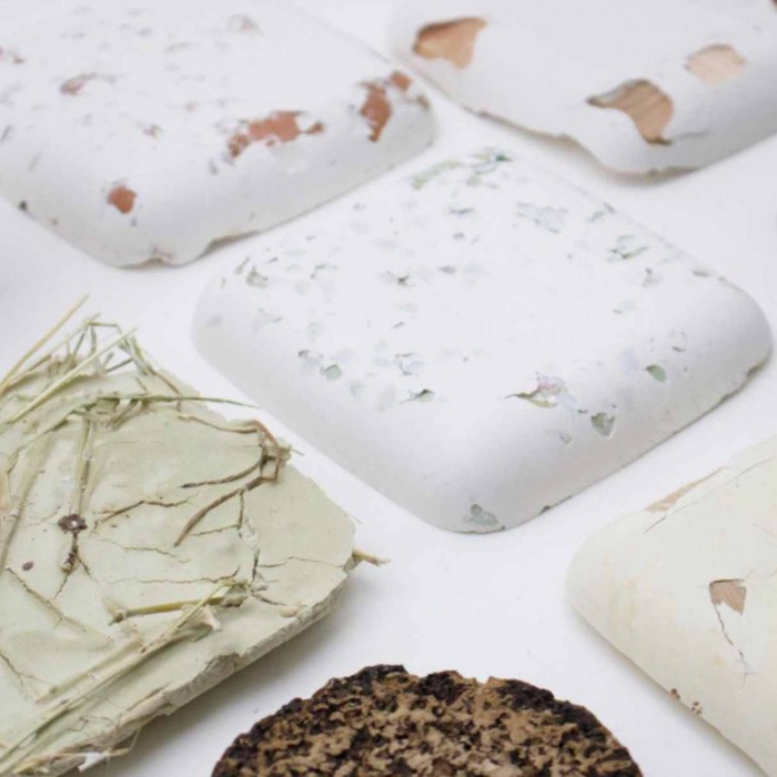 Individual design projects on show included ‘First We Eat’ by Central Saint Martins graduate Carlotta Guccione, which turned bricks in combination with food waste into ceramic roof tiles. ‘Frumo’ by product designer Mareen Baumeister also employed food waste, combining it with natural resin to create reusable flooring and furniture products. Another Central Saint Martins graduate, Alara Sipahioglu showcased ‘Crispy’, a project that transformed non-recyclable chip packets into a collection of serving bowls. ‘Growing up, I never wanted to be an office chair’ by Byron Clark provided an innovative take on office seating: created using furniture and timber offcuts, the cluster of mushroom-esque seats encouraged users to explore the childlike fun of seating.