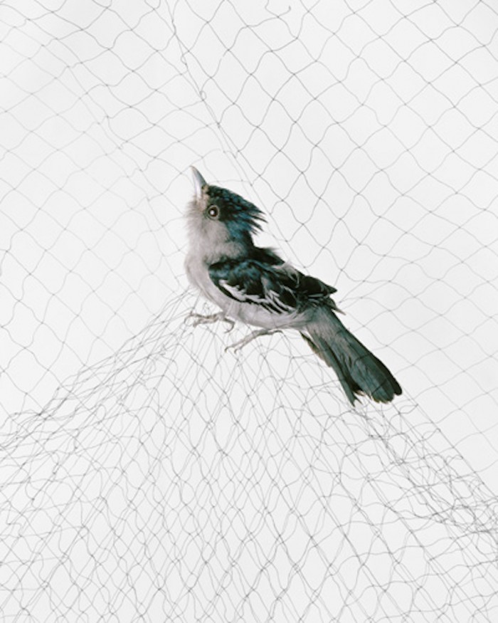 His photographs explore the human need to name, classify, and quantify diversity. In the photographs, the birds are neither free nor are they captive. They occupy a transitory moment in science.