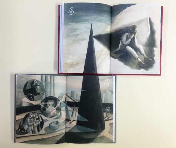 The hardcover edition comes in a boxed cover and includes two hardcover books. To follow the story, the reader has to alternate chapter-by-chapter, between the books and sometimes, has to rotate corresponding full-page illustrations to create a full image.