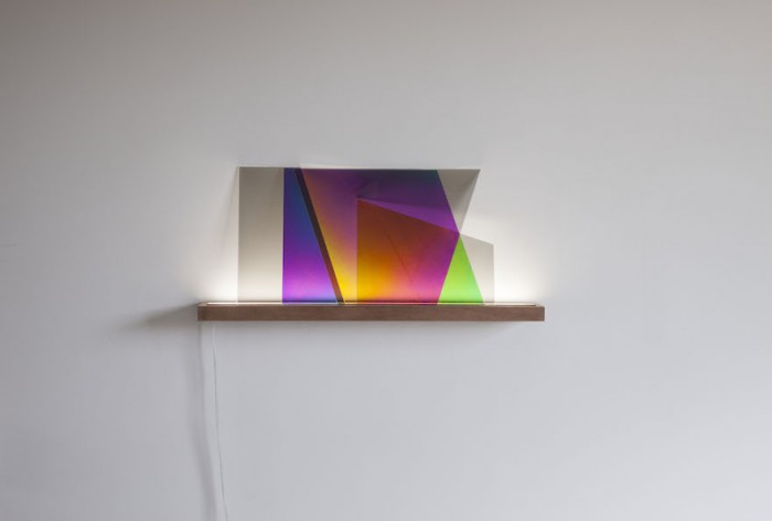The light comprises a number of seemingly transparent sheets and a wooden stand featuring a light. The sheets, however, have been specially treated so that when they overlap, new colours can be seen. This is a reproduction of a crystalline quality normally only found in the highlands of Iceland. Endless combinations can be made – a constant reminder that light is, in fact, a dynamic force.