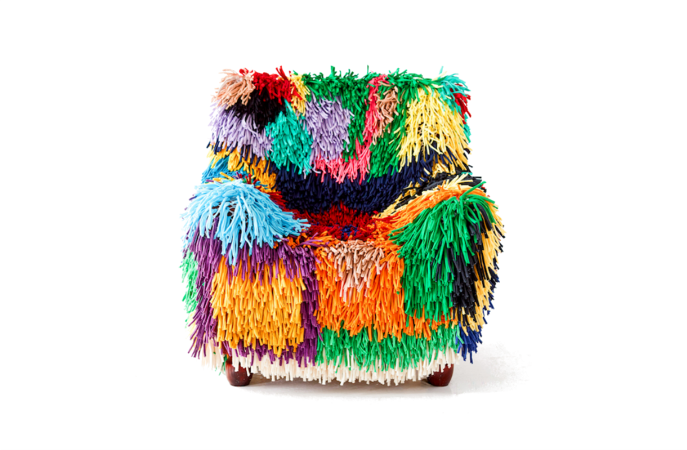 RAGAMUF, the stretchy rug knitted from surplus fabric from the textile industry is the brainchild of owner and founder Martta Leskelä. Designed by Finnish designer Tuula Pöyhönen, the rug fits chairs of different shapes and sizes. The fluffy and colourful rug can transform an old chair into a snuggly piece of furniture.