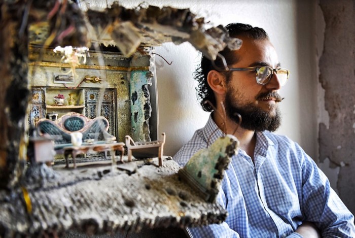 He set out to capture the devastation wrought on the homes and streets of his city, creating miniature dioramas out of found objects, scrap metal and paint. The artworks are at once beautiful and terrible – the cutaway walls of broken buildings reveal interiors of undisturbed furniture, while Mercedes-Benz vehicles idle on bombed streets.