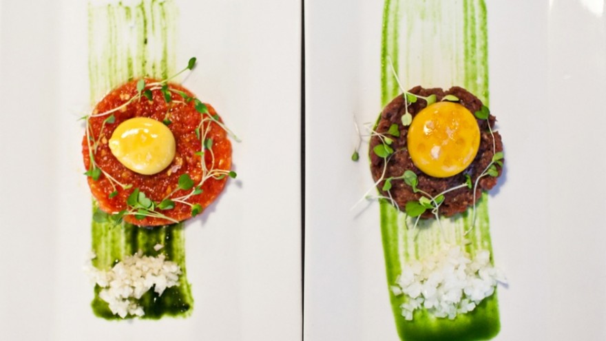Executed by the San Francisco culinary collective Studiofeast, headed up by Mike Lee, the group had no intention of making it easy for themselves. The omnivore and vegetarian versions had to look identical without repeating any of the ingredients (besides the basics like oil and salt), and no vegetarian meat substitutes such as tofurky were allowed.