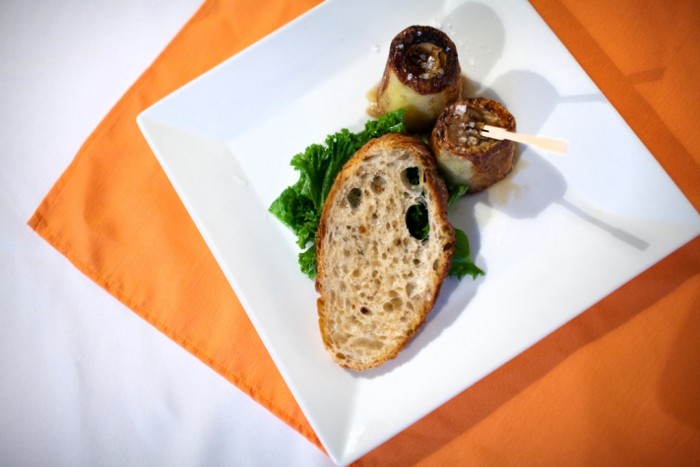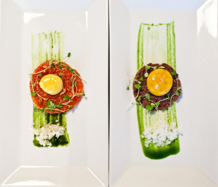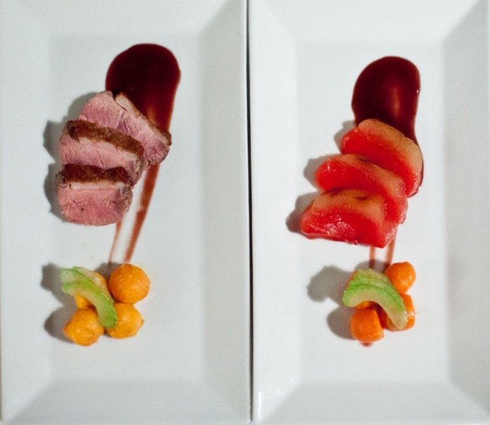 So, the omnivore might be served roasted beef bone marrow, mustard greens and duck-fat toast, while the vegetarian version would be yukon gold potato bone with onion marrow, kale salad, and miso butter toast. Salmon roe was swapped out for apricot roe, beef tartar for tomato tartar, duck for watermelon and scallop for tofu.