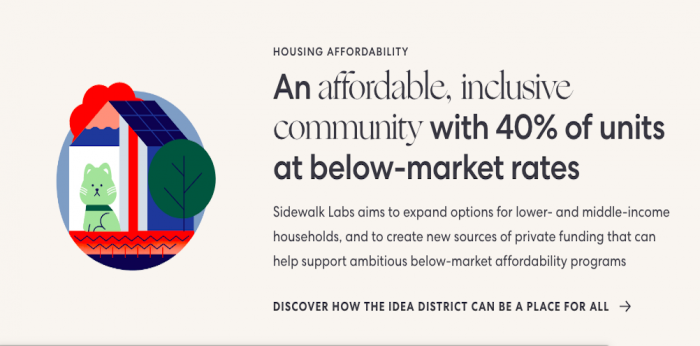 “Sidewalk Labs proposes a plan for Quayside that would create a diverse live-work neighbourhood, connect to the GTA, generate new economic opportunities for more people, and explore new innovations to dramatically improve quality of life.”
