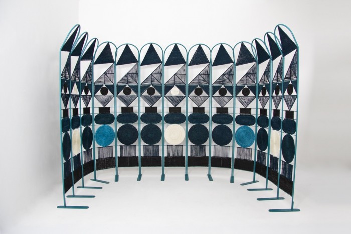 DAM: Adriaan went to Swaziland to see Gone Rural's set up and different ways of weaving. Then we set about designing the functionality and proportions of the screen. Once we had that down, Katy and Phillipa started designing the woven inserts. A lot of backwards and forwards, sample making, testing and choosing colours took place. We made the sample frame and sent it to Swaziland; final samples where made... and then changed again. The project took place under extreme time pressure, across borders in order to get it ready for the launch at 100% Design. But it all come together because we trusted each other and delivered on our promises.