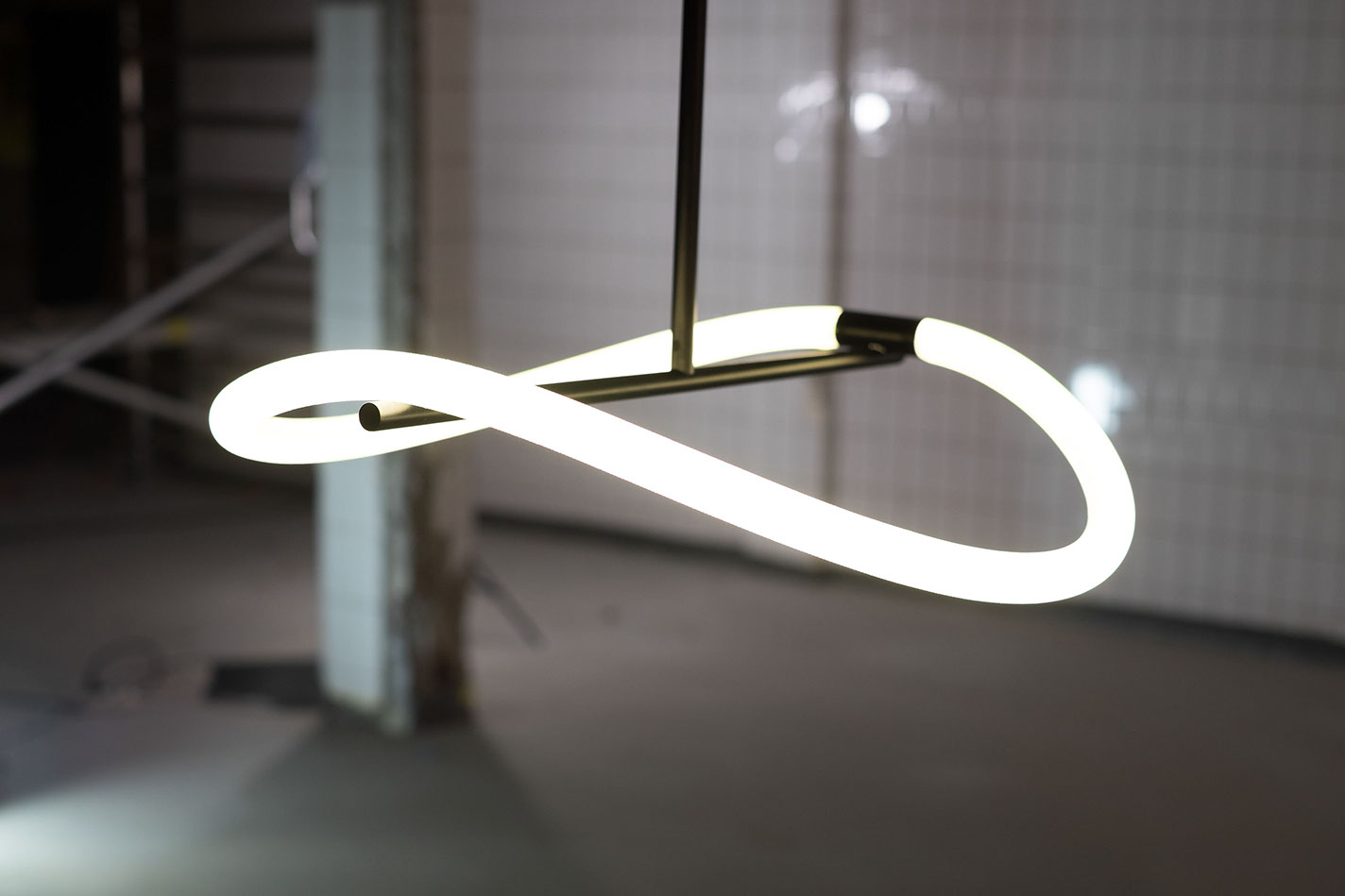 The pendant lights are the same basic structure as the floor lamps but turned upside down. Suspended from a pair of thin steel rods, the pendant lamps highlight the flexibility of the LEDs, allowing owners to adjust its shape.