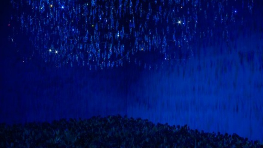 ”I wanted to imagine a space with no gravity,” Nicolas commented about his two pieces. Such suspension was created by floating small crystal sculptures lit by a battery-powered LED inside large, free-floating, helium-filled, transparent balloons. A separate design consisted of a 10m-long string of crystals incorporating LED lighting that was programmed to set off "sparks" that jumped along the length of the rope.