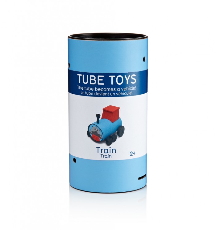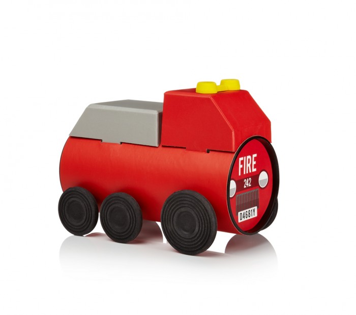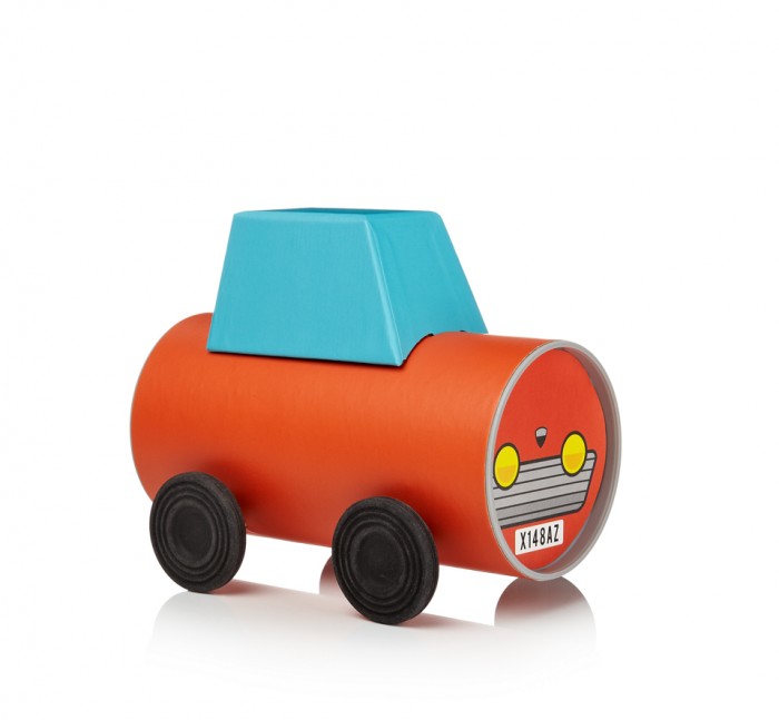 Cars, fire engines, trains and tractors are contained in a standard cardboard tube, which doubles as the body of the toy. Each tube has pre-cut slots for the placement of wheels, axes and other pieces.