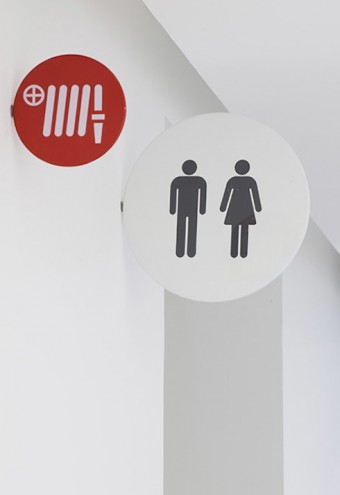 The family of signage consists of discs in various sizes that point students in the direction of desired faculties or student facilities around the university campus. Miller further designed alternatives to the multiple-sized discs to fully integrate the signage with the architecture. In some instances lettering is pin-mounted directly onto the walls, and for the studio workspaces oversized numbers are silkscreened directly on walls.