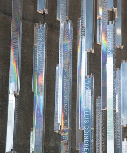 Pentagram’s Miller has added a contemporary element to an otherwise rustic building in northeast Mexico. The renowned graphic designer’s signage for the university makes use of pristine white lettering, glossy white signage discs and glassy prisms, a material and visual counterpoint to the rough grey off-shutter concrete walls of the building.