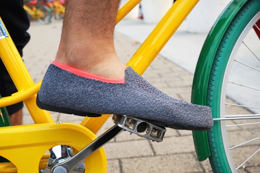 The design process is seemingly simple. Much like 3D printing, a design is programmed into a computer and then sent to a knitting machine, which knits the shoe in a method that produces the exact amount of material for each product, leaving no waste during production.