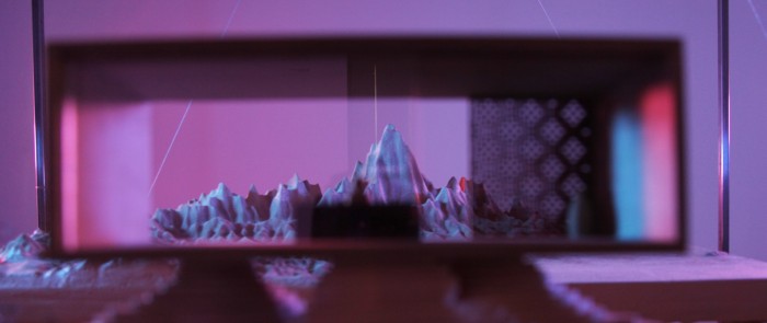 His installation consists of two parts, a swinging landscape and an architecture model. The audience observes the swinging landscape through the windows of the tiny model. As the “dreamscape” swings side to side, its hidden bottom becomes visible.