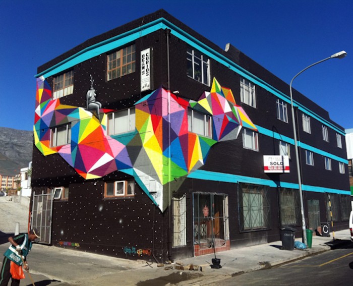 By Spanish artist, Okuda San Miguel, the mural that hugs the black wall outside Side Street Studios is an explosion of geometric colours. In a recent interview with Design Indaba, Okuda explained that he had initially been in South Africa at the invitation of the City of Gold Urban Art Festival in Johannesburg where he painted a wall with German artist, Case.