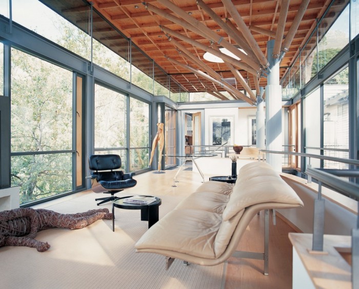 Besides its romantic nod to nature, the house provides an environmentally responsive solution. Purity of materials is important to the architects and the warmth of wooden ceiling, cupboards and floors contrasts with the stainless-steel fittings, steel gratings and aluminium windows and stairs.