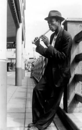 Sof'town, Kofifi and its shebeen culture represented the South African ideal - a harmonious mix of cultures, colours, races, art, music and life. The Manhattan Brothers, under Nathan Dambuza Mdlele, the Woody Wood Peckers, under Boy Masango, the Merry Blackbirds and other big band groups developed their music. Dolly Rathebe and Dorothy Masuku, Miriam Makeba and Letta Mbulu sang the blues in nightclubs, shebeens and dancehalls. Gangsters paraded their fancy clothes and fancier ladies. It was hip, it was happening; it was the centre of the universe. Well-to-do men adopted the American 'zoot suits' and slang. The English-speaking residents referred to the community as 'Little Harlem'. Man, those jazz men were styling in their suits and tails. They often wore straw hats called 'dops' (with a narrow brim) or felt hats called 'ten gallons' (with a wider brim) or berets as they played the trumpet, clarinet or saxophone. The women's skirts swirled around as their dance partners spun them around the dance floors. It was jazz from morning and all through the night. The tsaba tsaba was the dance at the time of the American Jitterbug, known locally as 'jive'. Men and women danced towards each other, shaking the knees in a 'rubber legged' style and grinding their pelvises. Just before the couple reached each other they shouted 'Tsaba!' and they danced backwards to their starting points. Flashily dressed gangsters in Palm Beach suits, straw hats and white shoes - the 'Berliners' from the Western Township, the 'Americans' from Sophiatown and the 'Spoilers' from Alexandra township - would grab the beautiful girls and dance them around with knives or guns in their pockets. These were the street wise and sassy tsotsis. The noasisas (female hustlers) wore broad skirts and carried large handbags. Both the noasisas and the tsotsis lived very glamorous lifestyles making a lot of money from looting, stealing, pick pocketing and shoplifting. They bought swanky clothes and went to the cinema everyday where their heroes were the screen greats of Noir Cinema like Humphrey Bogart in The Maltese Falcon and Richard Widmark in Street With No Name.