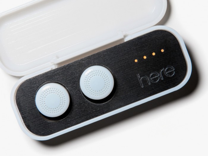 The size and slick design of the Here earbuds mask the complexity of their components: a microphone and speaker, a lithium-ion battery, which lasts around 4-6 hours, and a Bluetooth radio.